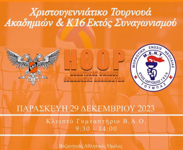 Ο Βυζαντινός Αθλητικός Όμιλος φιλοξενεί στο κλειστό γυμναστήριο Β.Α.Ο. “ΜΕΝΕΛΑΟΣ ΓΚΡΑΤΖΙΟΣ”, την Παρασκευή 29 Δεκεμβρίου 2023 από 9:30 μέχρι 14:00, χριστουγεννιάτικο τουρνουά Ακαδημιών και Κ16 Εκτός Συναγωνισμού.